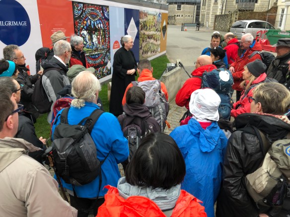 Walked 17km non stop with 50 walkers of a walking group from Arras. I don’t know who’s idea it was not to have a break. I like 1 hour walk 5 min rest. Blessed by Canon Claire outside the Cathedral 7:50, then walked off into the drizzly rain. It cleared up later in the morning. Coffee and cake at the church in Shepherdswell after about 4 hours walking, then rescued by a pint or two in the Bells Inn pub with John Clark